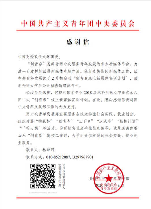 (入党积极分子张心宇进入团中央“创青春”线上新媒体实训计划)